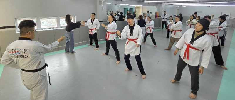 발달장애인은 태권도를 배우고 도장을 힘차게 달리며 장애물을 넘고 앞구르기를 하는 등 여러가지 운동에 매진한다.