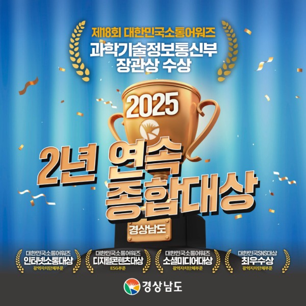 경상남도(도지사 박완수)는 제18회 대한민국소통어워즈에서 2년 연속 ‘종합대상’인 과학기술정보통신부 장관상을 수상하며, 공공 소통을 선도하는 지자체로서의 위상을 굳혔다.