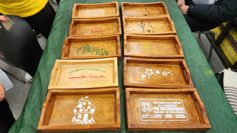 경남조은장애인평생학교 학생들은 1교시 미술심리치료 수업 후 2교시 목공예 시간에 우드 트레이를 만들어보았습니다. 트레이 조각을 끼워맞추고 못으로 박아 고정시켜주었습니다. 트레이를 사포로 부드럽게 갈아서 만졌을때 부드러운 느낌이 날수 있도록 날카로운 부분을 문질러주었습니다. 그런다음 원하는 색을 스펀지에 묻혀 발라주고 1차로 말려준 후 원하는 필름지를 가지고 와서 위에 물감을 톡톡 찍어발라줍니다. 완전히 말려준 후 바니실을 발라 코팅해주었습니다. 실용적이고 즐거운 목공예 시간이었습니다