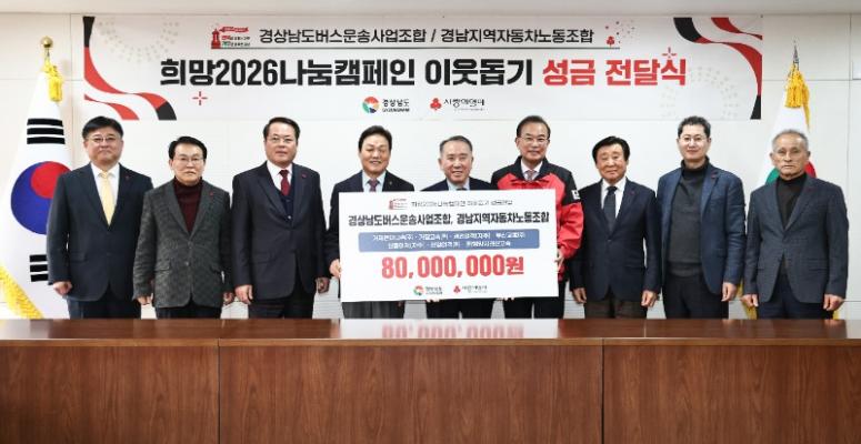 경남 버스운송사업조합‧노동조합, 취약계층 돕기 성금 8천만 원 기탁 - 29일, 도청서 전달식 가져... 의료비 지원 및 사회복지시설 지원- 박완수 지사, “어려운 여건 속에서도 따뜻한 손길에 감사” 경상남도(도지사 박완수)는 29일 도청 소회의실에서...