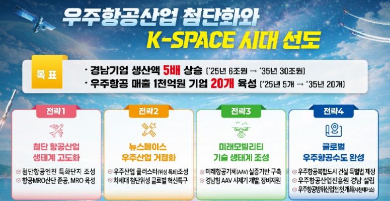 경남도, 우주항공산업 첨단화와 K-Space 시대 선도! - 첨단항공산업 생태계 고도화 등 4대 전략 추진으로 2035년 생산액 30조 원 달성- 첨단항공엔진 특화단지 조성, 민·군 통합 항공MRO 산업거점 활약- 우주산업 클러스터 구축 등 2,137...