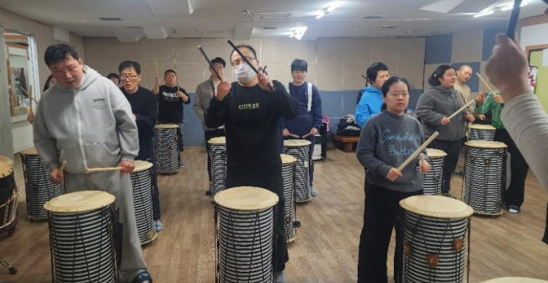 뜨레봄의 발달장애인들이 난타 연주에 여념이 없다.강사의 하나,둘, 셋,넷, 하는 소리에 맞추어 신나게 두드리며 한껏 신이나 있다.발달장애인주간활동센터 뜨레봄은 발달장애인들이 난타배우기 체험활동을 지원하며 생활의 활력을 제공하고 있다. ...