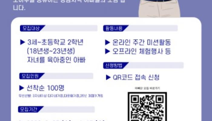 “초보 아빠 다 모여라”경남도, ‘100인의 아빠단’ 8기 모집 - 3세~초2 자녀 둔 아빠 대상, 4월 15일까지 100명 선착순 모집- 온라인 미션·체험 프로그램·육아멘토링 등 다양한 활동 참여- ‘크리에이터단’ 별도 운영... 육아 공감대 형성․참여 확산 도모 경상남도(도지사 박완수)와 인구보건복지협회 경남지회(회장 윤성미)는 아빠의...