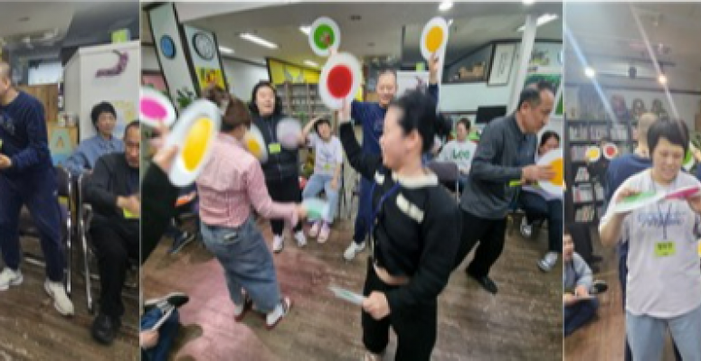 발달장애인들이 함께 박수를 치며 신나게 율동을 즐거워한다.접시를 활용하여 발달장애인들이 힘차게 박수치며 장고팀, 북팀, 쾡가리팀, 징팀 으로 나누어 각자의 역할을 하며 돌아가며 신나게 노래를 부르며 사물놀이를 즐기며 모두 하나가 되어 즐거움을 함께 ...