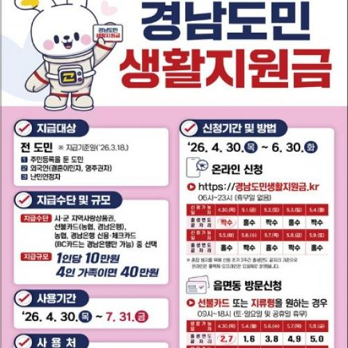 경남도 경제부지사, 경남도민 생활지원금현장 점검 나서… 관계자 격려 - 경남도 민원콜센터, 창원 의창동·동읍 주민복지센터 방문 점검- 4월 30일 09시부터 접수 개시.. 첫날은 출생연도 끝자리 2와 7 신청 경상남도는 오는 4월 30일부터 지급을 시작하는 ‘경남도민 생활지원금’의 원활한 추진을 위해 경남도 간부공무원이 사전 준비 상황을 ...