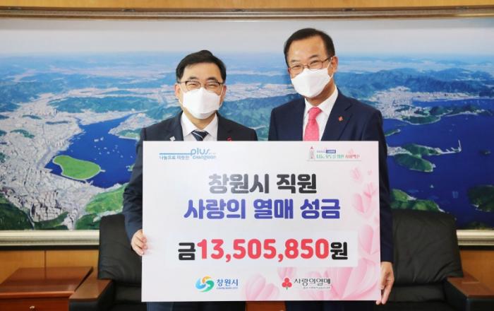 창원시 직원, 희망2022나눔캠페인 사랑의 열매 성금 기탁직원 3,805명 13,505,850원 기부 분위기 조성창원시(시장 허성무)는 7일 오전 11시 10분 창원시 전직원들이 사랑의 열매달기 캠페인을 통해 모금된 성금 1350만 원을 경남사회복지공동모금회에 기탁했다