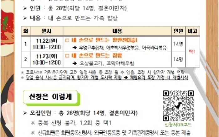 창원시건강가정다문화가족지원센터 11월 프로그램 참가자 모집 안내창원시건강가정다문화가족지원센터에서 실시하는 11월 프로그램에 다음과 같이 참가자를 모집하오니 많은 참여바랍니다.○ 즐거운 도서관 가족나들이(4차) 1. 활동기간 : 2021. 11. 20.(토) 10:0