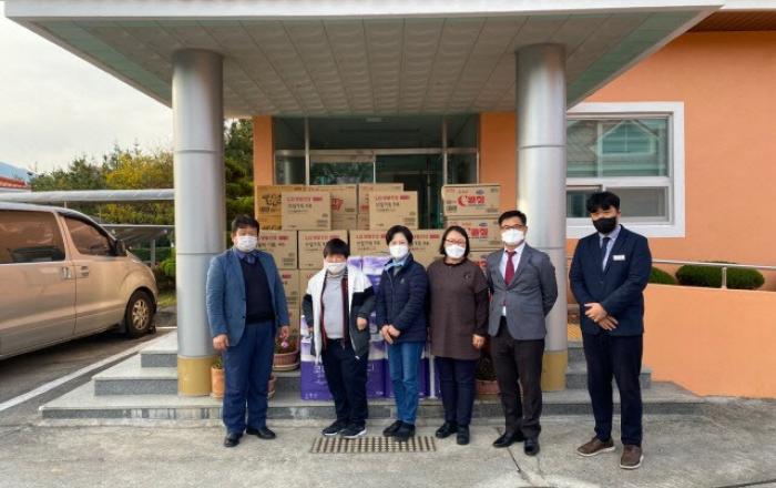 대전~통영 간 고속도로에 위치한 경남 산청(양방향)휴게소와 주유소 직원으로 구성된 ㈜대교의 ‘사랑닷컴’ 회원들이 지난 2일 위드코로나 시대를 맞아 최소인원이 장애인복지시설인 산청 이레마을을 방문해 후원물품 전달했다. 사진제공=산청휴게소.산청휴게소. 봉사활동으로 나눔 경