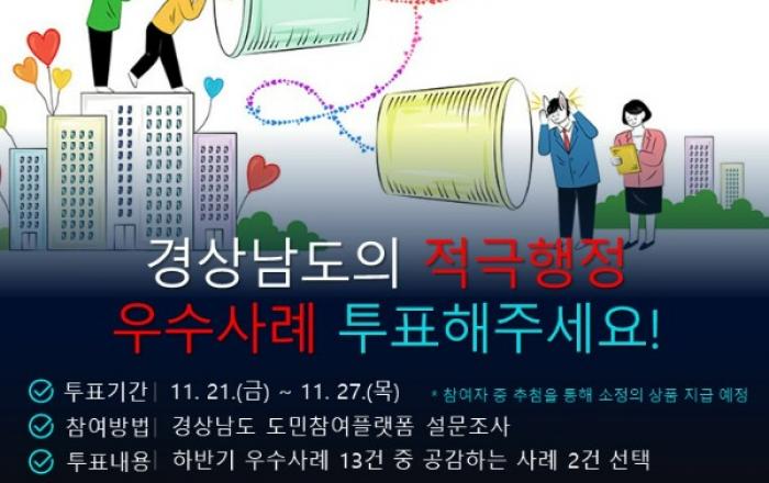 경남도, ‘적극행정 우수사례’ 도민투표 27일까지 진행 - 도민 누구나 경남도 도민참여플랫폼에서 참여 가능- 적극행정 사례 8건 중 공감되는 2건 투표... 추첨 통해 상품권 제공- 도민투표‧직원평가·모니터링단·서면·발표심사 등 종합해 선정- 12월 말 최종 5건 선정
