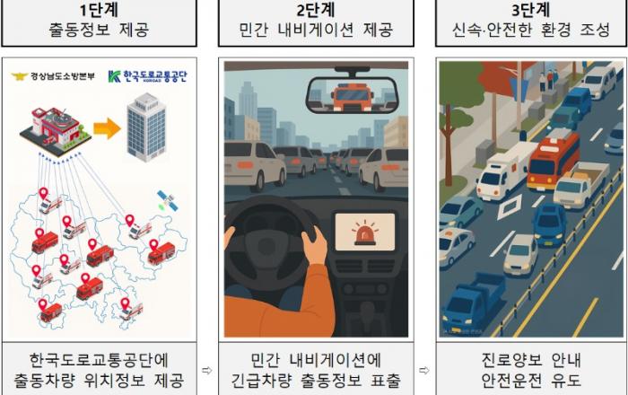 전국 최초, 경남 ‘소방차 접근 정보’...내비게이션으로 확인하세요 - 도로상 ‘소방차량 접근’ 알림, 교차로 ‘우선신호 작동’ 정보 제공- 카카오내비를 시작으로 다양한 내비게이션으로 서비스 확대 예정 경상남도 소방본부(본부장 이동원)는 긴급출동 중인 소방차량의 접근