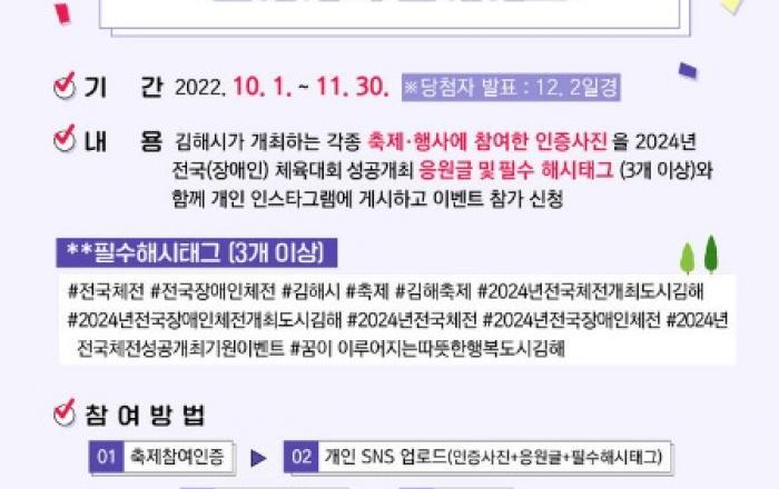 김해시, 전국(장애인)체전 성공개최 기원 SNS 이벤트김해시 2024년 전국체전, 전국장애인체전 주 개최도시[김해=뉴시스] 김상우 기자 = 경남 김해시는 ‘2024년 전국(장애인)체전 성공개최 기원 SNS 이벤트’를 진행한다고 29일 밝혔다.이벤트는 대한민국 국민 누구