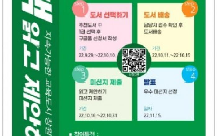 선선한 바람이 불어오는 가을, 책 한권 읽어보는건 어떠신가요?지속가능한 창원을 위한 신청접수가 시작됩니다.추천 도서 목록 중 원하시는 책을 배송 받아 읽고, 참여특전을 위한 미션을 수행해보아요~!■ 신청 기간 : 22. 9. 29.(목) ~ 22. 10. 10.(월)