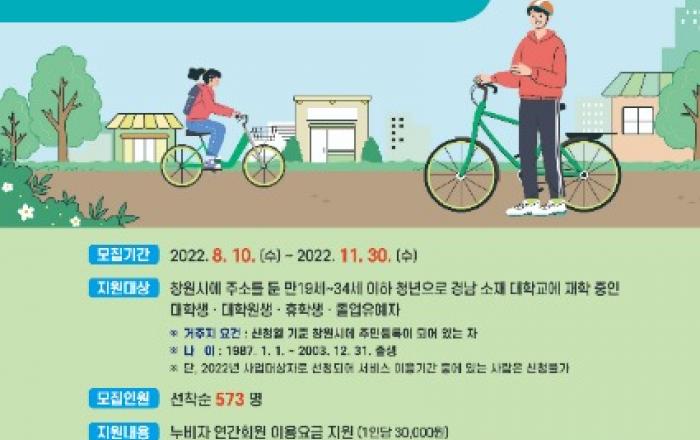2022년 대학생 누비자 이용 교통비 지원사업 대상자 모집□ 대상자 모집 개요 1. 모집기간 : 2022. 8. 10.(수) 09:00 ~ 2022. 11. 30.(수) 24:00 2. 모집인원 : 선착순 573명 3. 신청자격 : 창원시에 주소를 둔 만19