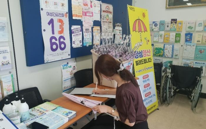 명곡동, 무더위야 가라~~ 폭염대비 양심양산 대여실시건강한 여름나기를 위한 양심양산 대여서비스 시작 창원특례시 의창구 명곡동(동장 김성환)은 지난 7월 8일부터 두 달간 ‘폭염대비 양심 양산 대여 서비스’를 실시한다고 밝혔다. 폭염주의보가 발효되고 있는 요즘 행정