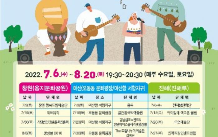 창원특례시, 매주 수요일‧토요일 야외 음악회 개최진해, 창원, 마산에서 무더운 여름밤을 식혀줄 야외 음악회 개최창원특례시(시장 홍남표)는 지난 6일 진해루에서, 9일은 용지문화공원과 마산항 서항지구에서 200여명의 시민들의 호응 속에 올해 첫 수요 및 토요음악회를 개최