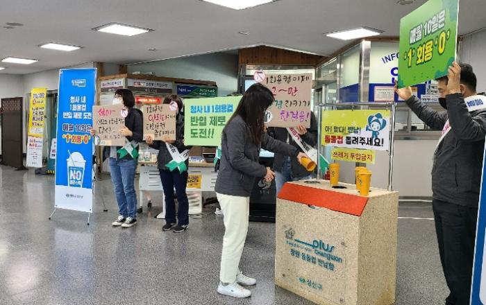 1회용컵 없는 성산구, 직원부터 실천해요!창원시 성산구(구청장 안병오)에서는 3월 3일 청사 내에서 1회용컵 사용량 증가를 억제하고 전직원이 1회용컵 대신 개인텀블러나 다회용컵 사용의 생활화를 목표로 ‘청사 내 1회용 컵 반입 제로’에 도전하기 위한 캠페인을 실시하였다