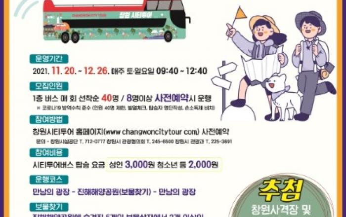창원시“시티투어버스타고 보물 찾으면서 일상회복해요”자녀와 함께하는 ‘시티투어버스 타고 떠나는 보물찾기 여행Ⅲ’ 참가자 모집창원시(시장 허성무)는 이달부터 단계적 일상회복이 시작된 가운데 그동안 거리두기로 지쳤던 시민들에게 특별한 체험 기회를 선물하면서 창원관광을 홍보하
