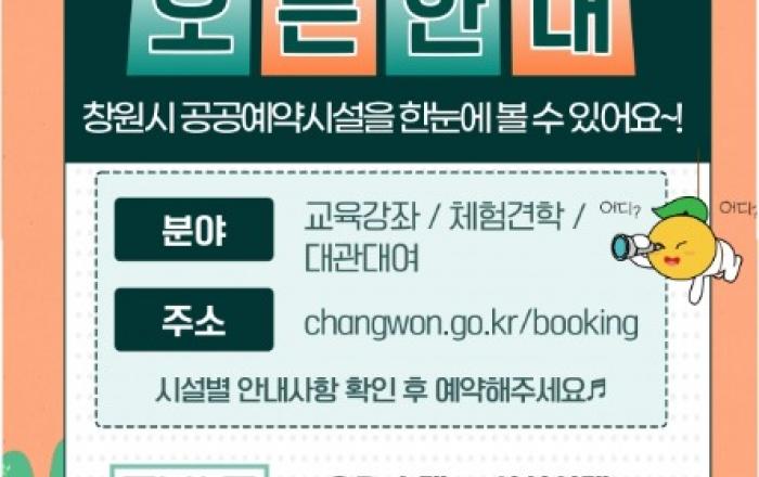 [일상플러스+ 통합예약시스템 서비스] 시행****일상플러스+ 통합예약시스템 서비스가 12월 1일부로 시행되오니 많은 이용 부탁드립니다!! ****○ 서비스명 : 일상플러스+ 통합예약시스템○ 접속주소 : www.changwon.go.kr/booking○ 서비스 내용