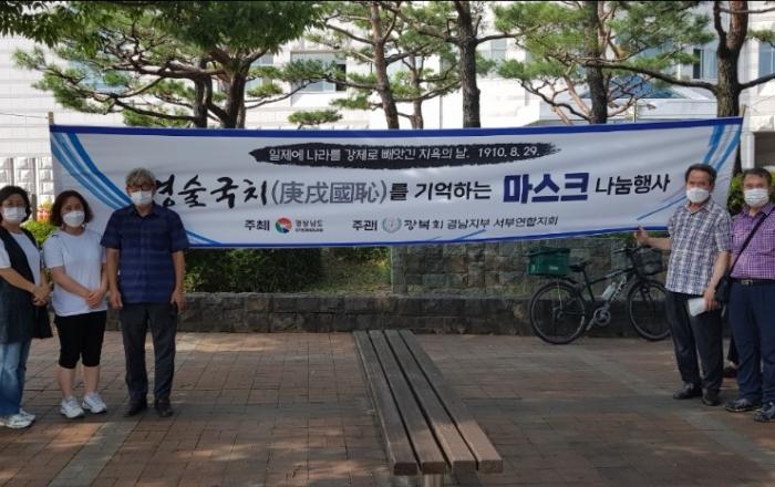 광복회 경남서부연합지회, 경술국치일 홍보 마스크 나눔- 일제에 의한 국권 상실의 날 기억해주세요 -광복회 경남서부연합지회(회장 정기민)는 지난 27일 진주시청 앞에서 마스크 무료 나눔 행사를 가졌다.이날 행사는 일제의 침략으로 국권을 상실한 1910년 8월 29일의 경