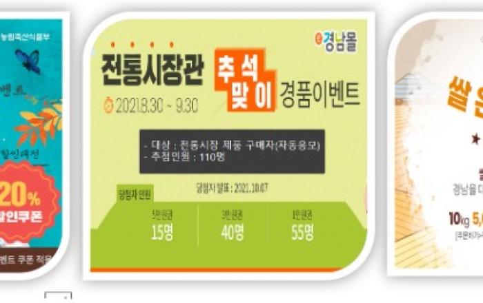 [e경남몰] 2021년 추석맞이 할인기획전 안내어느덧 추석이 다가오고 있습니다.이번에도 e경남몰에서 다양한 이벤트를 준비하였습니다.꼭 한번 둘러주세요. 경남사랑!! e경남몰 사랑!! ★ 모든 할인쿠폰은 주문단계에서 적용됩니다. ★★ 전시군 제로페이