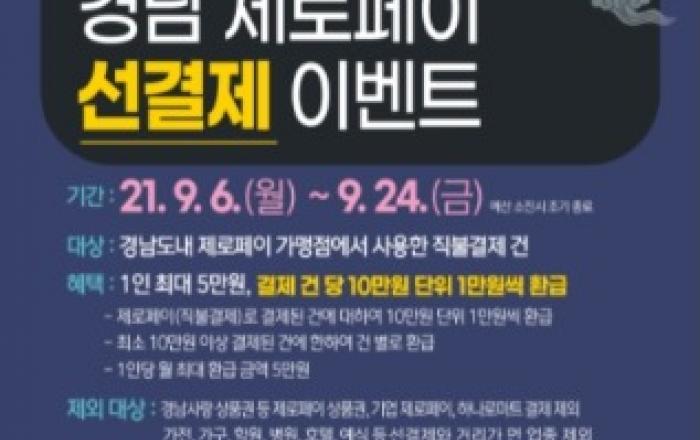 ‘추석맞이 경남 제로페이 선결제 이벤트’ 진행- 제로페이 직불 결제를 통한 희망 선(先)결제 동참 유도- 10만 원 이상 결제 고객, 10만 원 단위별 1만 원씩 환급(최대 5만원) 경상남도와 (재)경상남도경제진흥원(원장 강성윤)은 코로나19로 어려움을 겪고 있는 소상