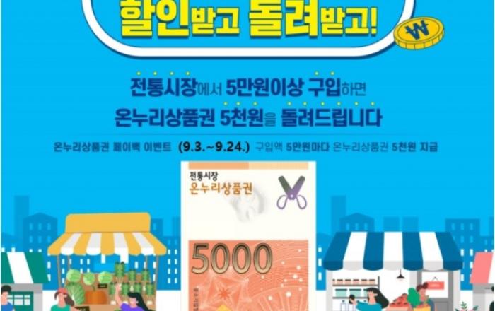 이번 추석엔 전통시장 장보기 어때요~ - 9월 24일까지 도내 50곳 전통시장 온누리상품권 환급 행사- 5만 원 이상 구매 시 5천 원 상품권 환급, 2차 소비확산 기대특별방역점검기간 운영과 온라인 장보기로 전통시장 활성화 기대 경상남도는 추석연휴를 전후하여 전통시장
