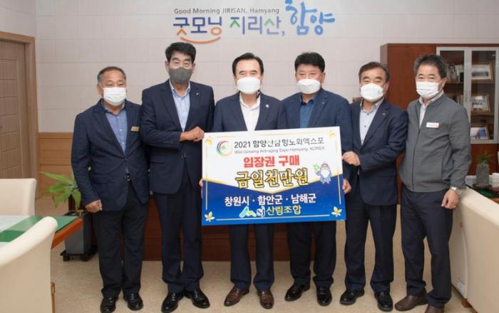 도내 산림조합 함양엑스포 입장권 1천만원 구매 약정산림유관기관 단체 엑스포 성공개최 기원함양군(군수 서춘수)는 7일 오후 창원시(조합장 박정동)·함안군(조합장 안상주)·남해군(조합장 정상영) 산림조합과 2021 함양산삼항노화 엑스포의 성공적 개최를 기원하며 입장권 1,