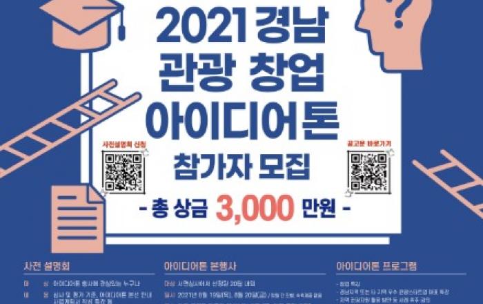 경남 청년들이여! 성공을 원하시면 관광 창업 아이디어톤 도전! - 2021년 경남 관광 창업 아이디어톤 개최, 시상금 10개팀 총 3천만 원- 7월 1일부터 8월 6일까지 서류접수 진행 중 8월 16일에 심사 발표- 8월 19일~20일, 그랜드 머큐어 앰배서더 창원 호