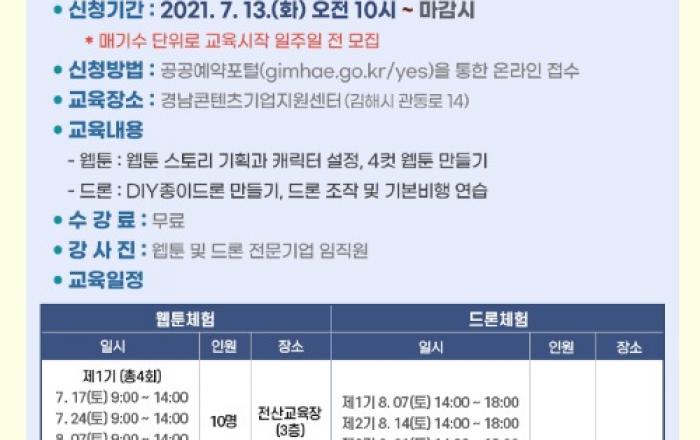 김해시, 웹툰.드론체험 특별교육 실시김해시는 시민들을 대상으로 관심과 흥미가 높으나 평소 접하기 어려운 첨단 디지털 교육 기회를 부여하고자 웹툰 및 드론체험 특별교육을 실시한다. 특히, 이번 교육은 김해시․경남콘텐츠기업지원센터․지역 ICT 전문기업과 연계 협력하여 추진
