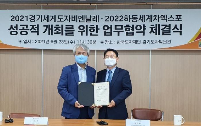 하동세계차엑스포조직위-한국도자재단 도자 및 차 문화·산업 발전 맞손 - 2022하동세계차엑스포-2021경기세계도자비엔날레, 성공 개최 업무협약 체결 하동세계차엑스포조직위원회(위원장 김경수 도지사)는 23일 경기도자박물관에서 한국도자재단(대표이사 최연)과 도자 및 차
