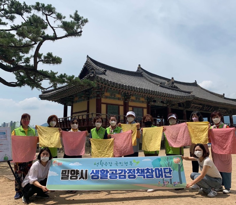 밀양시 생활공감정책참여단 회원 10여 명이 참여한 이번 캠페인은 밀양시자원봉사센터와 경상남도자원봉사센터가 함께 진행하는 기후위기 대응 활동 중 하나로 영남루를 찾은 시민, 관광객과 함께 물티슈, 핸드타올 등 일회용품을 대체할 수 있는 손수건 100장을 현장에서 직접 염색하여 시민과 관광객들에게 무료로 배부했다.
