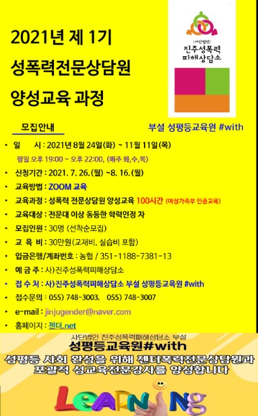 (사)진주성폭력피해상담소 부설 성평등교육원 #with 성폭력전문상담원양성 교육 공고입니다.