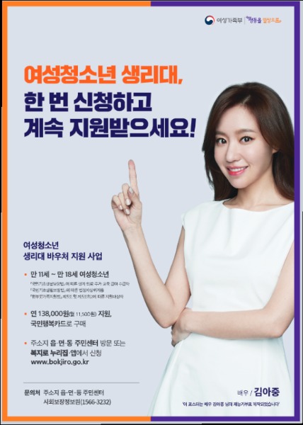 ㅇ 지원내용 : 보건위생물품(생리대)을 구매할 수 있는 바우처(연 최대 138천원)