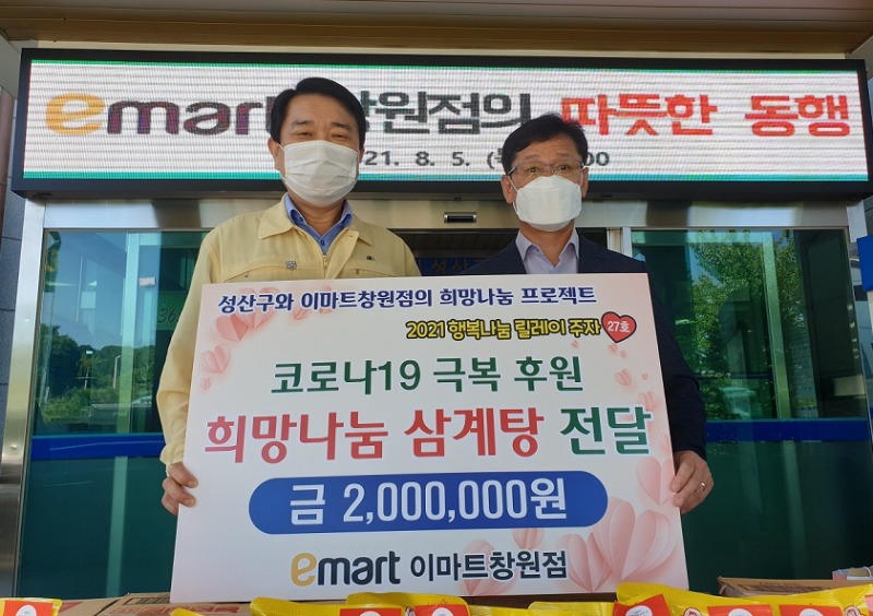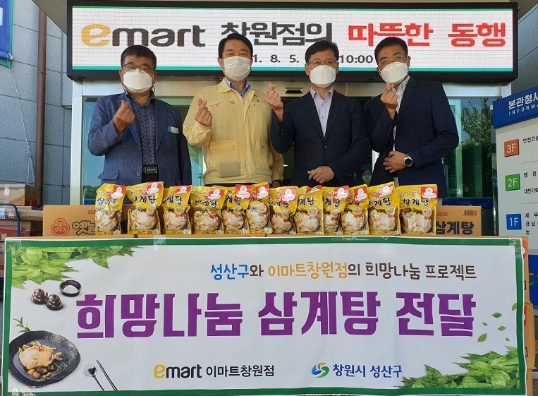 창원시 성산구(구청장 오성택)는 5일 이마트창원점(점장 황상필)에서 관내 생활이 어려운 노인 세대에 200만 원 상당의 ‘희망나눔 삼계탕’ 을 전달했다고 밝혔다.