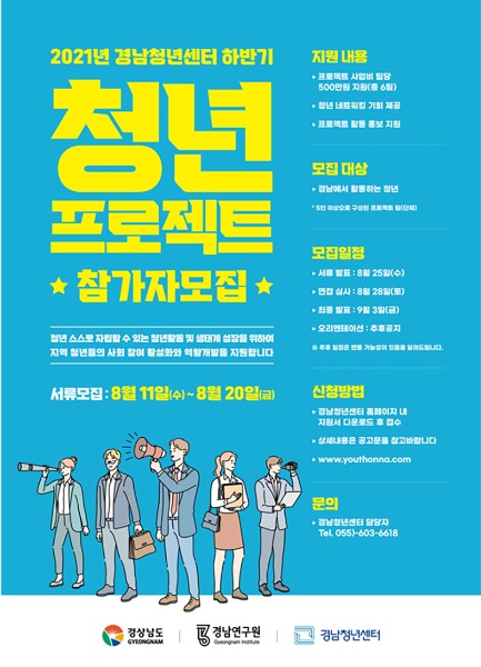 경상남도와 경남청년센터는 청년들의 지역사회 참여 활성화 및 활동 지원을 위한 ‘청년 프로젝트 지원 사업’에 참여할 6팀을 모집한다고 밝혔다.