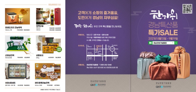 경남관광재단은 다가오는 추석 명절을 맞아 9월 19일까지 경남 18개 시·군 특산품과 경남관광기념품 공모전 수상 상품 등 경남관광기념품점에 있는 전체 입점 상품에 대하여 할인판매를 진행한다고 밝혔다.