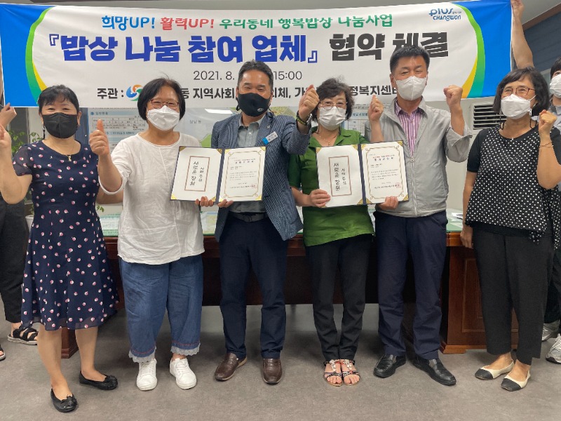 창원시 성산구 가음정동(동장 배기철)은 24일 코로나19로 어려운 소상공인 업체와 어려운 이웃 모두를 위한 민관협력 특화사업 추진을 위해 가음정동 행정복지센터에서 『희망Up! 활력Up! 우리동네 행복밥상 나눔사업』 협약식을 개최했다.