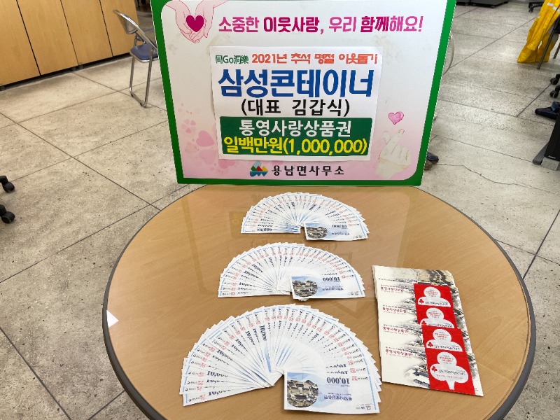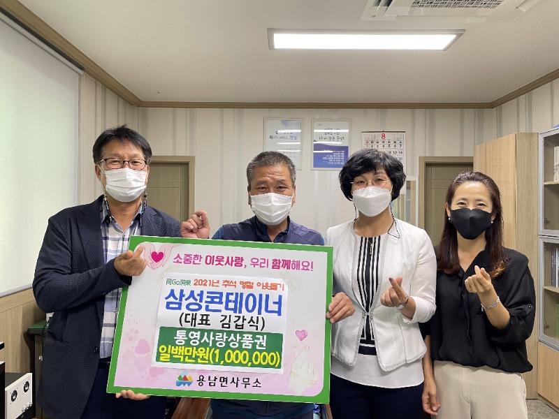 통영시 용남면 소재 삼성콘테이너는 이동식 주택 설치 및 컨테이너, 철구조물 제조 전문업체로 평소 어려운 이웃에 대한 관심을 가지고, 매 명절뿐만 아니라 혹한기 및 혹서기에도 이웃 나눔을 실천해오고 있으며 코로나19로 더욱 쓸쓸할 명절을 보낼 어려운 이웃에 대한 따뜻한 손길을 나누고자 同GO洞樂 용남면!“용남 나눔人 뱅크”나눔 실천에 흔쾌히 참여하게 되었다.