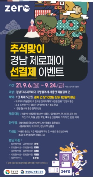 경상남도와 (재)경상남도경제진흥원(원장 강성윤)은 코로나19로 어려움을 겪고 있는 소상공인 경영부담을 줄이고 소비 활성화를 위해 ‘추석맞이 경남 제로페이 선결제 이벤트’를 9월 6일부터 실시한다.
