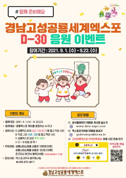 (재)경남고성공룡세계엑스포조직위원회(위원장 백두현)는 2021경남고성공룡세계엑스포가 한 달여 앞으로 다가옴에 따라, 9월 1일부터 ‘고성공룡엑스포 개최 D-30 응원 이벤트’를 진행한다.