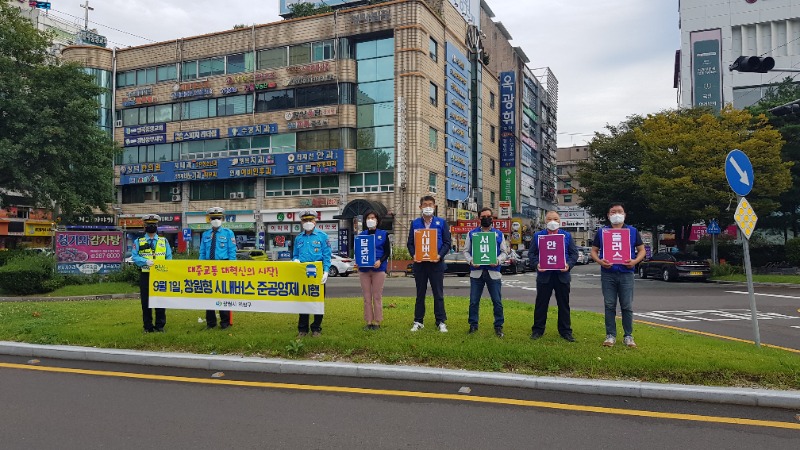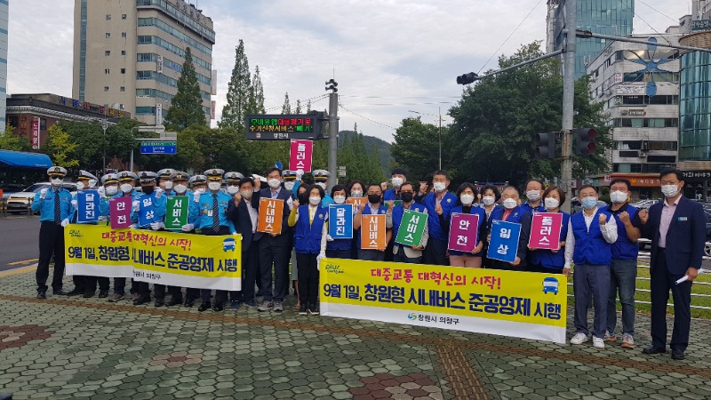 창원시 의창구는 28일 의창구 명곡광장 사거리에서 바르게살기운동 의창구협의회 및 창원 서부모범운전자회 등 40여 명이 함께 9월 1일부터 시행된 시내버스 준공영제를 알리고, 시내버스 이용률을 높이기 위한 출근길 캠페인을 가졌다.