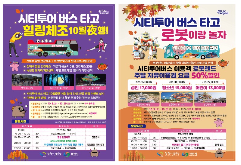 창원시(시장 허성무)는 시티투어버스 탑승자에게 특별한 여가 활동 기회를 제공하기 위해 마련한 ‘시티투어버스 타고 힐링체조 10월夜행’, ‘시티투어버스 타고 로봇이랑 놀자’ 프로그램 참가자를 10월 한 달간 선착순 모집한다고 28일 밝혔다.