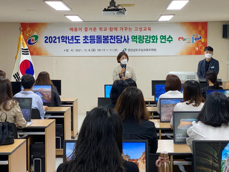 고성교육지원청 컴퓨터실에서 실시한 이번 연수는 업무 관련 실습 위주로 진행되었으며 초등돌봄교실 관련 회계 및 공문서 작성 등 업무 역량 강화, 코로나19 대비 초등돌봄교실 운영 우수 사례 공유, 돌봄전담사와의 협력적 네트워크 구축을 통한 현장 소통과 공유를 위하여 개최되었다.