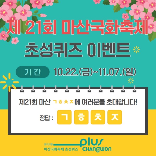 창원시(시장 허성무)는 오는 27일부터 11월 7일까지 개최되는 「제21회 마산국화축제」를 맞아 전국민 대상으로 초성퀴즈 이벤트를 오는 22일부터 축제 마지막날 11월 7일까지 개최한다고 21일 밝혔다.