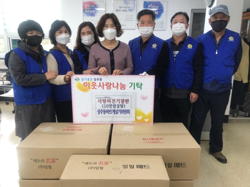 성주동바르게살기위원회(위원장 서종민)는 1일 성주동(동장 최영숙)을 찾아 사랑의 전기장판(50만원상당)을 기탁하였다.