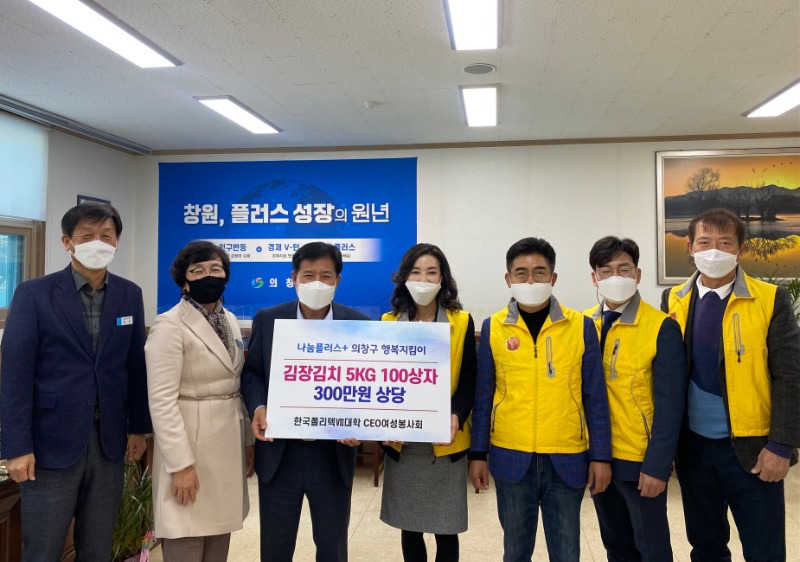 창원시 의창구(구청장 황규종)는 24일 한국폴리텍Ⅶ대학 CEO여성봉사회(회장 이지윤)에서 김장김치 100상자 (300만 원 상당)을 기탁해 왔다고 밝혔다.