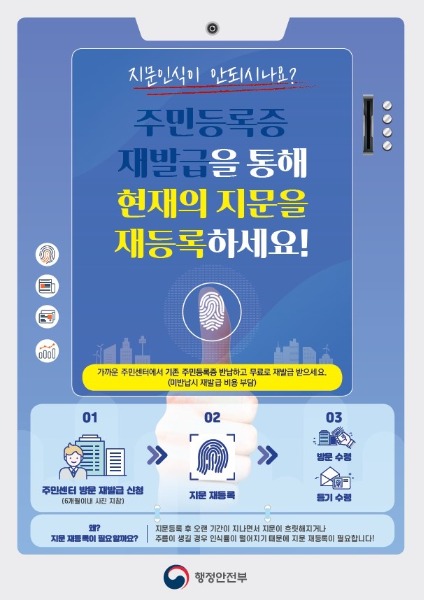 지문 재등록 사유 외에도 ▲ 사진, 글씨 마모 등 자연적 결함 ▲ 2006년 이전에 발급되어 보안기능이 약한 주민등록증 ▲ 사고로 인한 외과적 수술(미용, 성형수술은 불가)의 경우에도 주민등록증을 무료로 재발급받을 수 있다.