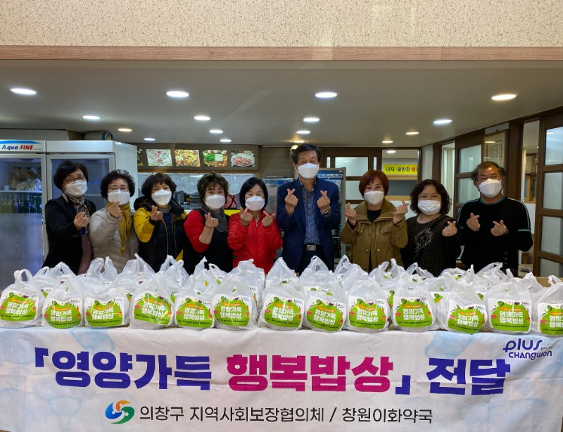 영양가득 행복밥상 지원사업은 창원이화약국(대표 김명숙)에서 후원하는 사업으로 의창구 읍면동 지역사회보장협의체(위원장 황금자)에서 홀로 지내시는 어르신 50명을 찾아가 관내 식당 봉담정에서 준비한 영양식을 전달하고 안부를 확인하는 지역공동체 돌봄사업이다.