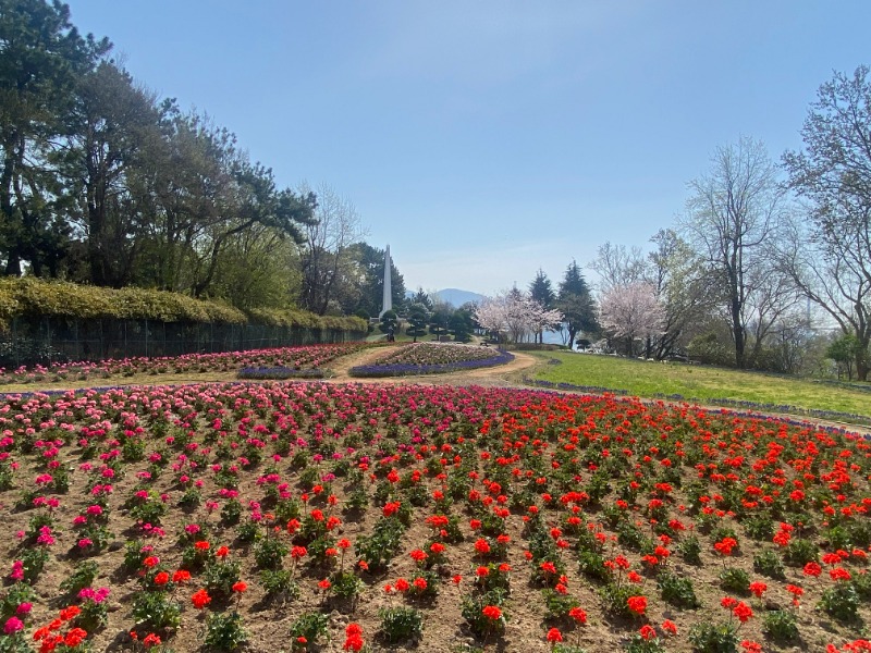 튤립, 팬지, 무스카리 등 봄꽃 만발한 돝섬에서 푸른 바다 정취 만끽