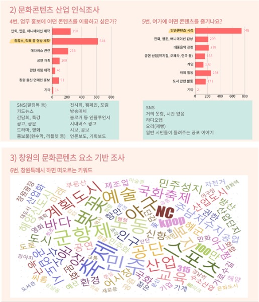 창원특례시는 지난 4월 「창원 콘텐츠산업 발전을 위한 설문조사」를 진행했다. 창원시 공무원 1,000명을 대상으로 진행한 이번 설문조사는 ▲문화콘텐츠 산업 인식조사 ▲창원의 문화콘텐츠 요소 기반조사 등 19문항으로 이루어졌으며 창원의 콘텐츠 산업이 나아가야 할 방향, 관련 인재 육성, 현장실무 강화 등을 지원하는 데에 쓰일 계획이다.
